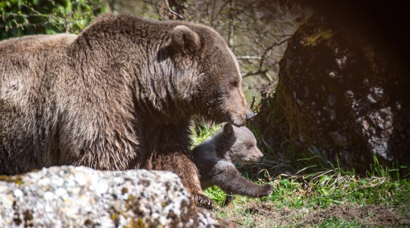 Unsere zwei Jungbären haben sich über Ostern zum ersten Mal den Gästen gezeigt. Gemeinsam mit Mutter Tamar verlassen sie nun zunehmend die Winterhöhle und erkunden die Aussenanlage.
